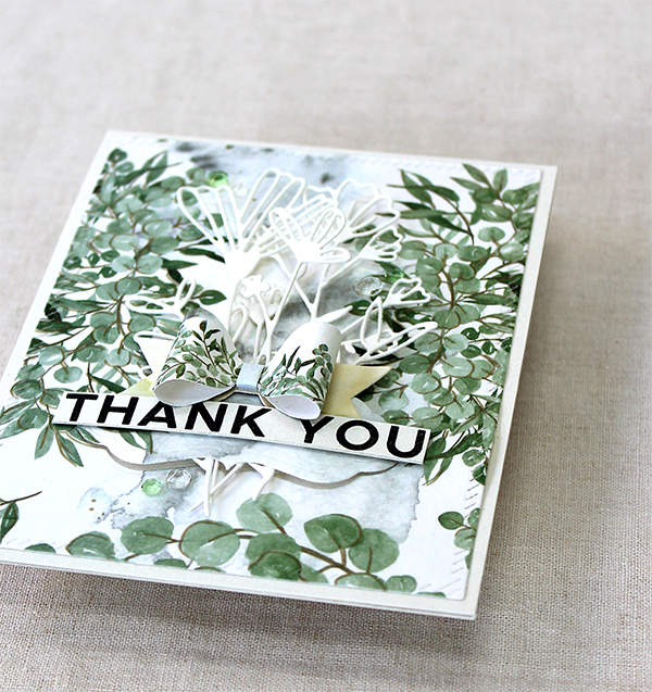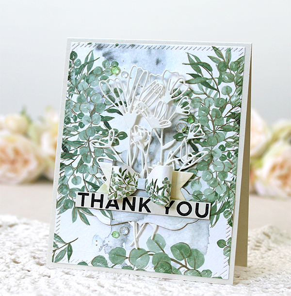With the Eucalyptus Fantasy Washi Tape, I made a fresh green leaves background. I adhered washi tape to white card stock first, and then die cut it with the Diagonal Stitched Rectangle Panel Die. I then die cut one of the Noteworthy Frames from the bottom of the washi taped background.
